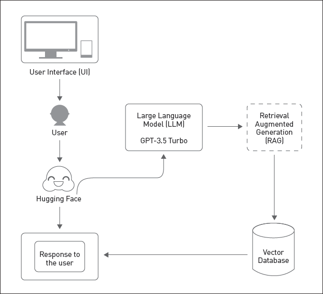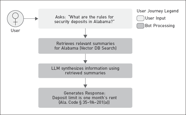 Figure 1 depicts the architecture of the Landlord-Tenant Rights Bot, which is built on three integrated components hosted on the Hugging Face platform: a user interface, a large language model, and a retrieval-augmented generation pipeline connected to a curated vector database. The core of the system is the retrieval-augmented generation (RAG) architecture. This multistep process is the key to ensuring factual safety. When a user asks a question, the system first converts that query into a numerical representation, or embedding, which captures its semantic meaning. This embedding is then used to perform a similarity search across a custom vector database, which contains thousands of chunked legal summaries from all 50 U.S. states. The most semantically relevant text chunks are retrieved and dynamically inserted into a new, detailed prompt that is sent to the language model (OpenAI's GPT-3.5 Turbo). The model is then explicitly instructed to synthesize a clear, human-readable answer based primarily on the provided text. This entire process can be visualized as a focused user journey, as illustrated in Figure 2.