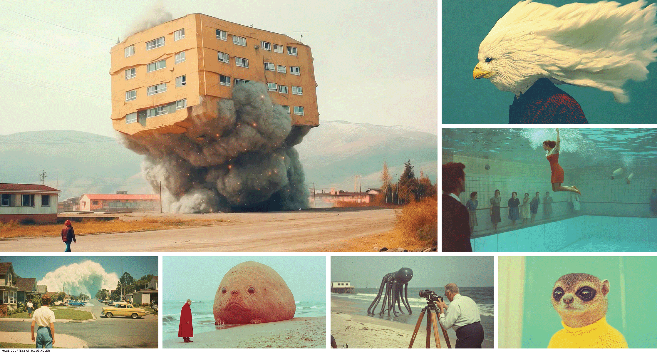 In this thought exercise, the film's narrator acknowledges that "recognizable scenes, faces, and objects are extremely rare islands in a vast sea of noise." But unlike Borges's librarians who aimlessly seek combinations of letters that offer a glimpse of decipherable words and meaning, Adler builds a universe of images that simultaneously evoke familiarity and surrealism. In conversation with Interactions, Adler observed that "image generators open access to the space of all possible images, enabling our imagination to traverse it at a far greater speed."