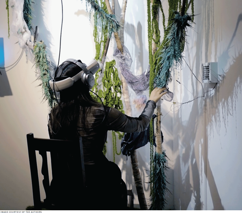 Sensing Nature [6] is a VR installation by Tianyuan Zhang (this article's coauthor), Wei Lin, and collaborators that aims to create a sense of connection between people and trees. It consists of a physical aspect: a 3D sculptural tree (Figure 1) that is covered in fabrics and contains motors, both of which aim to produce different haptic sensations when touched. It also has a virtual aspect (Figure 2). Audience members don a head-mounted display for a 13-minute interactive experience.