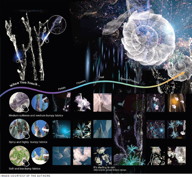![]() | Figure 2. The Sensing Nature installation includes several fabric textures that result in different visual and sonic interactions, including blooming flowers and falling leaves. |
