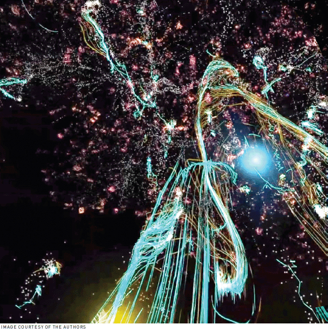 They see an abstract virtual tree slowly form out of particles (Figure 3). They can reach out and touch this tree and feel the physical tree since the real and virtual trees are accurately registered to have the same location relative to the participant. As they touch the tree, they see virtual energy flows passing between themselves and the tree. The points they touch bloom into flowers. After a while, rain starts falling and flowers grow from the ground, nourished by the tree's nutrients. The tree itself grows, nurtured by the energy given by the participant. It eventually towers over the participant and fades away as the virtual sun sets.